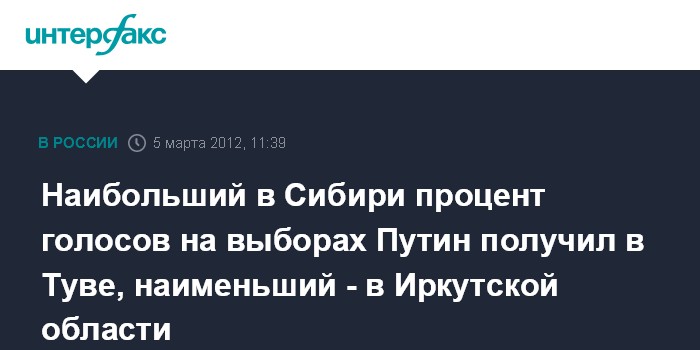 Наибольший в Сибири процент голосов на выборах Путин получил в Туве, наименьший - в Иркутской области