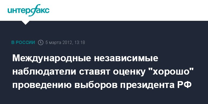 Москва. 5 марта. INTERFAX.RU - Выборы президента РФ прошли в соответствии с международными стандартами, с соблюдением принципов открытости, гласности и свободы, считают в международной группе независимых наблюдателей за выборами главы российского государства. "Голосование и подсчет голосов на выборах президента РФ прошли в соответствии с международными избирательными стандартами и законодательством Российской Федерации, с соблюдением принципов всеобщего равного избирательного права, открытых, гласных, свободных выборов", - зачитал представитель группы международных независимых наблюдателей Клайд Престон на пресс-конференции в Москве в понедельник выдержки из проекта итогового документа группы.