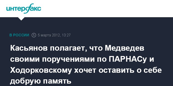 "Очевидно, Медведев хочет оставить о себе доброе воспоминание и продемонстрировать приверженность праву. Раз главная задача решена: Путин вернулся в Кремль, Медведеву пора вновь заняться имитацией либеральных тенденций в политической жизни", - сказал М.Касьянов в понедельник "Интерфаксу", комментируя поручение президента министерству юстиции РФ представить информацию об основаниях отказа в госрегистрации ПАРНАСа.