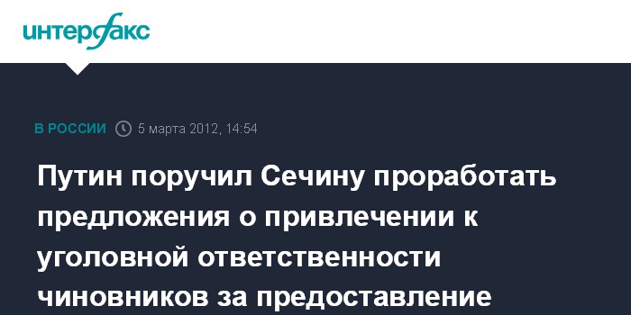 Ново-Огарево. 5 марта. INTERFAX.RU - Премьер-министр РФ Владимир Путин поручил вице-премьеру Игорю Сечину подготовить для внесения в Госдуму предложений о привлечении к уголовной ответственности должностных лиц госкомпаний за предоставление недостоверных сведений.