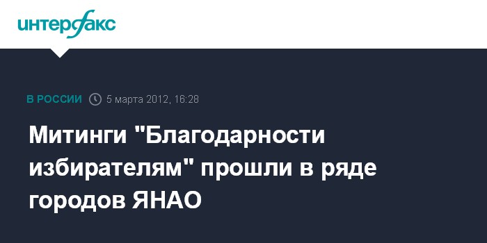 Салехард. 5 марта. INTERFAX.RU - Митинги, посвященные прошедшим президентским выборам и победе Владимира Путина, прошли в Салехарде, Новом Уренгое и Надыме, сообщили агентству "Интерфакс-Урал" в пресс-службе ямало-ненецкого отделения партии "Единая Россия".