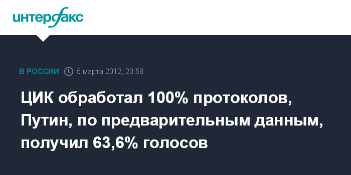 "Действительно, обработано 100% протоколов. Согласно полученным данным, Владимир Путин набрал 63,6% голосов. Но это предварительные данные. Официальные данные должны быть подведены в течение ближайших 10 дней", - сообщил в понедельник "Интерфаксу" заместитель председателя Центризбиркома Станислав Вавилов.