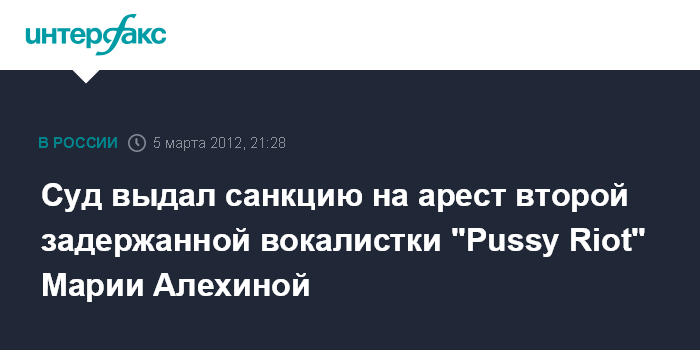 Москва. 5 марта. INTERFAX.RU - Таганский суд Москвы в понедельник санкционировал арест участницы феминистской панк-группы "Pussy Riot" Марии Алехиной, которая была задержана после нашумевшей акции в Храме Христа Спасителя.