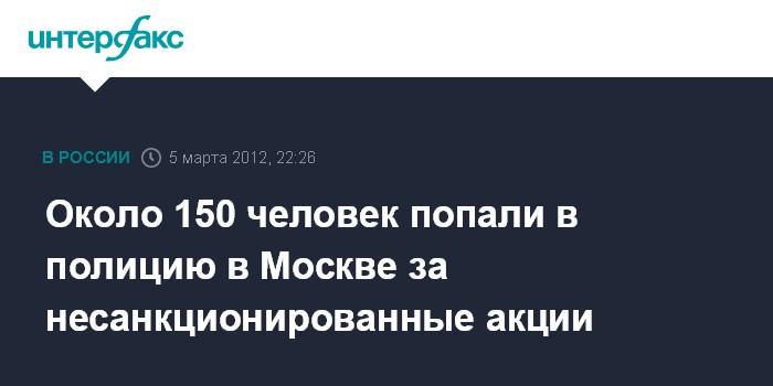 Москва. 56 марта. INTERFAX.RU - В Москве за участие в различных несанкционированных акциях задержаны около 150 человек, сообщил "Интерфаксу" высокопоставленный источник в ГУ МВД РФ по Москве.
