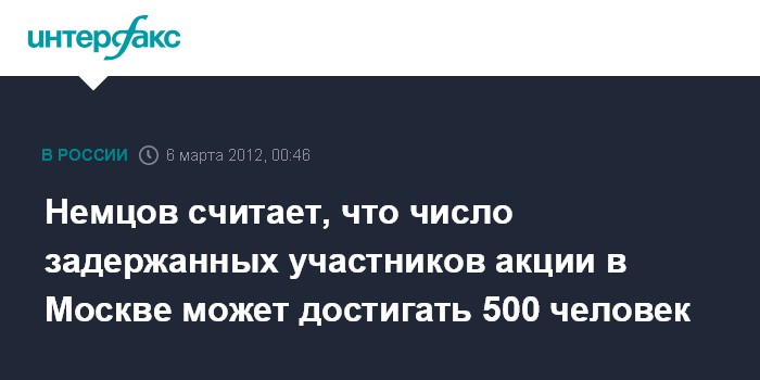 Москва. 6 марта. INTERFAX.RU - Число активистов оппозиции, задержанных полицией в понедельник в Москве после митинга на Пушкинской площади, может достигать 500 человек, сообщил "Интерфаксу" в ночь на вторник один из лидеров незарегистрированной "Партии народной свободы" Борис Немцов.