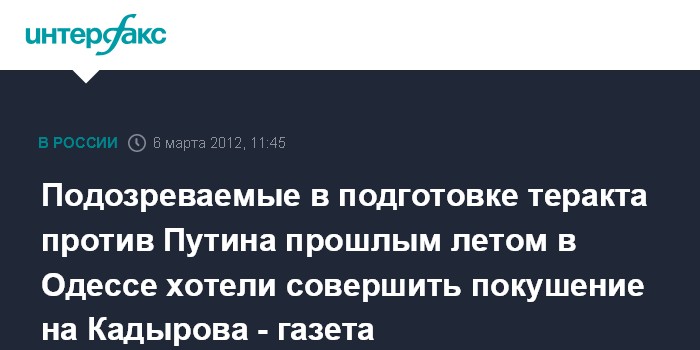 Киев. 6 марта. INTERFAX.RU - Задержанные в Одессе террористы, подозреваемые в подготовке покушения на премьер-министра РФ Владимира Путина, готовили также покушение на главу Чеченской Республики Рамзана Кадырова, сообщила во вторник газета "Сегодня" со ссылкой на одного из сотрудников одесского областного УВД.