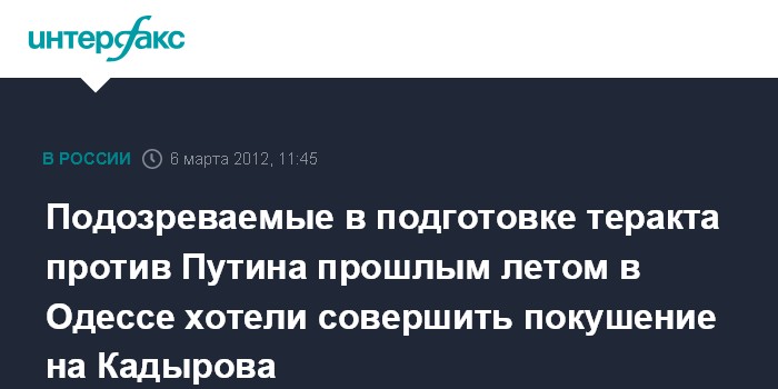 Киев. 6 марта. INTERFAX.RU - Задержанные в Одессе террористы, подозреваемые в подготовке покушения на премьер-министра РФ Владимира Путина, готовили также покушение на главу Чеченской Республики Рамзана Кадырова, сообщила во вторник газета "Сегодня" со ссылкой на одного из сотрудников одесского областного УВД.