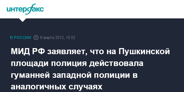 Москва. 6 марта. INTERFAX.RU - Московская полиция при разгоне несанкционированной акции в понедельник на Пушкинской площади действовала намного гуманней, чем иностранная полиция при разгоне акций "Оккупируй Уолл-Стрит" и палаточных лагерей в Европе, заявили в МИД РФ.