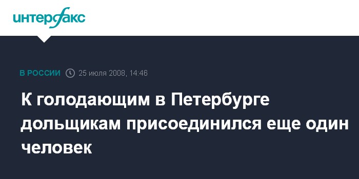 Москва. 25 июля. INTERFAX.RU - В Петербурге к голодающим дольщикам присоединился еще один участник, сообщил "Интерфаксу" представитель инициативной группы.
