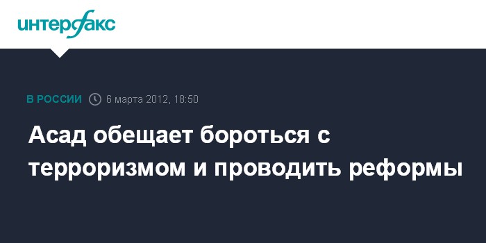 Бейрут. 6 марта. INTERFAX.RU - Президент Сирии Башар Асад пообещал во вторник провести в стране масштабные реформы и одержать победу в борьбе против террористов, сообщают официальные сирийские СМИ.