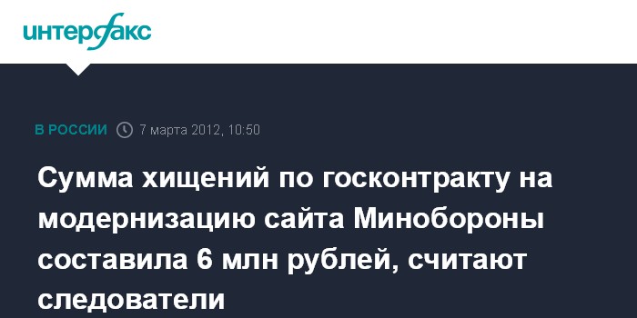 Главная военная прокуратура выяснила, что в начале 2010 года в Минобороны было составлено техническое задание на модернизацию программно-технического комплекса официального сайта ведомства. Госконтракт на общую сумму в 36 млн рублей был выигран компанией "Систематика". По версии следствия, стоимость работ была завышена, и военное следственное управление возбудило уголовное дело по факту мошенничества.