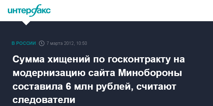 Москва. 7 марта. INTERFAX.RU - Военное следственное управление СКР возбудило уголовное дело по факту хищения в декабре 2010 года 6 млн рублей из рекордных 36 млн рублей, выделенных бюджетом на обновление официального сайта Минобороны, пишет в среду газета "Коммерсант".