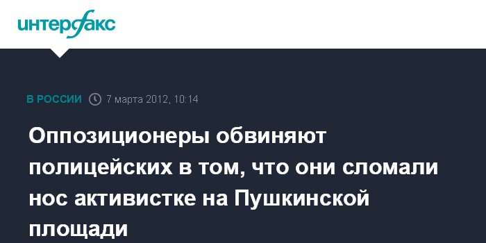 Москва. 7 марта. INTERFAX.RU - Оппозиция утверждает, что полицейские сломали нос одной из активисток Татьяне Кадиевой при задержании во вторник на Пушкинской площади Москвы.