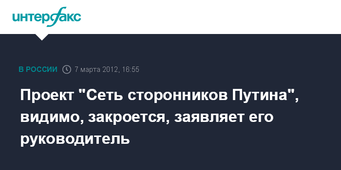 Москва. 7 марта. INTERFAX.RU - Проект "Сеть сторонников Путина" выполнил свое предназначение и может быть закрыт.