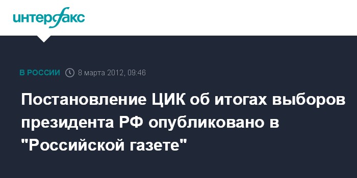 Москва. 8 марта. INTERFAX.RU - "Российская газета" публикует в четверг, 8 марта, постановление Центральной избирательной комиссии об официальных итогах выборов президента России, прошедших в минувшее воскресенье.