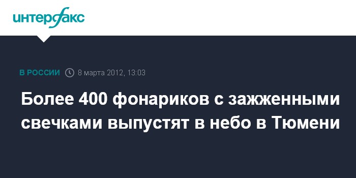 Тюмень. 8 марта. INTERFAX.RU - Необычная праздничная акция пройдет в четверг на набережной Туры в Тюмени - возле моста Влюбленных и в Историческом сквере. Принять участие в ней могут все желающие. В вечернее небо планируется запустить более 400 небесных фонариков с зажженными внутри свечками, сообщил агентству "Интерфакс-Урал" один из организаторов мероприятия.