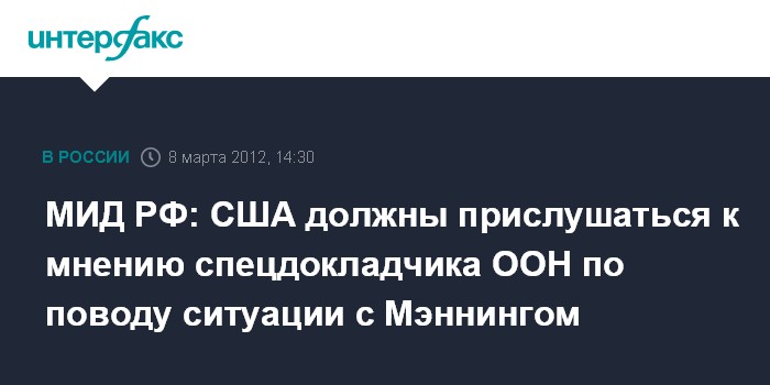 "Привлекло внимание заявление Хуана Мендеса, спецдокладчика Совета ООН по правам человека по вопросам о пытках, сделанное им 5 марта, в котором он обвинил американские власти в жестоком обращении с арестованным военнослужащим армии США Б.Мэннингом, обвиняемым в передаче секретной информации сетевому ресурсу "Викиликс", - говорится в комментарии уполномоченного МИД России по вопросам прав человека, демократии и верховенства права Константина Долгова, размещенного в четверг на сайте МИД РФ.