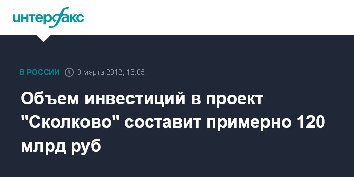 Объем инвестиций в проект "Сколково" составит примерно 120 млрд руб