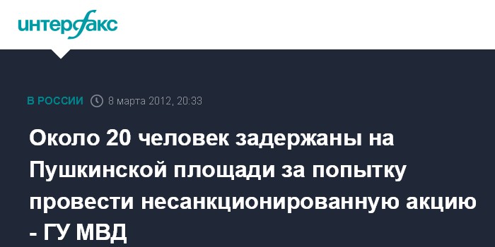Москва. 8 марта. ИНТЕРФАКС - До 20 человек задержаны полицией на Пушкинской площади в Москве при попытке проведения несанкционированной акции, сообщили "Интерфаксу" в пресс-службе ГУ МВД России по Москве в четверг.