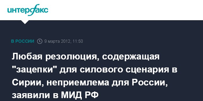 Москва. 9 марта. INTERFAX.RU - Любая резолюция СБ ООН по Сирии, подразумевающая силовой сценарий, недопустима для России. "Мы не согласимся с резолюцией СБ ООН по Сирии, содержащей любые зацепки для силовых действий против этой страны. Двусмысленность недопустима", - пишет замглавы МИД РФ Геннадий Гатилов в своем твиттер-аккаунте.
