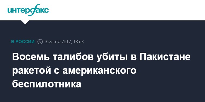 Исламабад. 9 марта. INTERFAX.RU - В результате атаки американского беспилотного летательного аппарата (БПЛА) в Пакистане в районе границы с Афганистаном убиты не менее восьми боевиков движения "Талибан", сообщила местная служба безопасности. БПЛА выпустил две ракеты по автомобилю, в котором передвигались талибы. Вместе с тем, пока не ясно, были ли среди них высокопоставленные представители движения.
