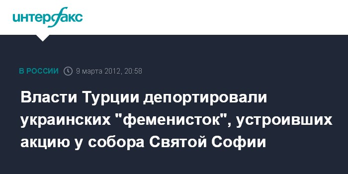 Киев. 9 марта. ИНТЕРФАКС-УКРАИНА - Власти Турции депортировали из страны четырех активисток украинского движения Femen, которые в Международный женский день провели акцию протеста у собора Святой Софии в Стамбуле, сообщает "5 канал" в пятницу вечером.