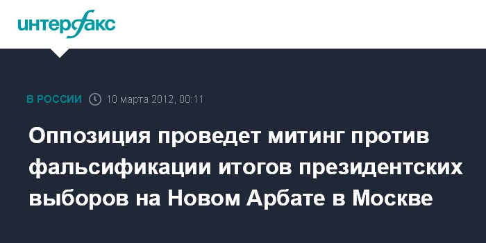 Москва. 10 марта. ИНТЕРФАКС - Пятый за последние три месяца санкционированный властями многотысячный митинг протеста против нарушений избирательного законодательства проведет оппозиция в субботу в Москве на Новом Арбате.