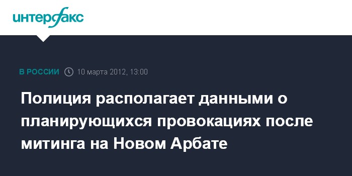 Москва. 10 марта. INTERFAX.RU - Московская полиция получила информацию о планах провокаторов организовать беспорядки после митинга оппозиции 10 марта на Новом Арбате.