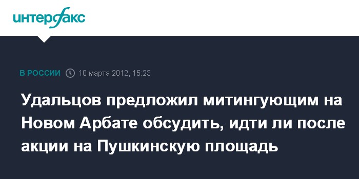 Москва. 10 марта. INTERFAX.RU - Оппозиционер Сергей Удальцов не исключил, что часть манифестантов в субботу перейдет после митинга на Новом Арбате на Пушкинскую площадь.