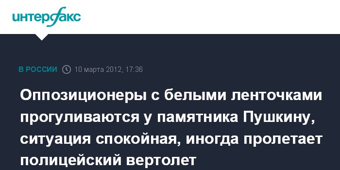 Оппозиционеры с белыми ленточками прогуливаются у памятника Пушкину, ситуация спокойная, иногда пролетает полицейский вертолет