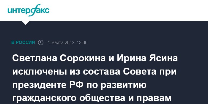 8 декабря прошлого года известная телеведущая, член Академии Российского телевидения С.Сорокина, а также экономист-публицист, правозащитница И.Ясина объявили о выходе из состава президентского Совета в знак протеста против фальсификации результатов выборов в Госдуму 4 декабря 2011 года.
