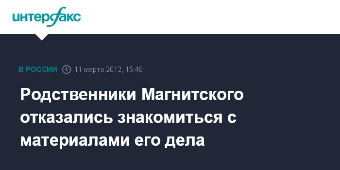 Москва. 11 марта. INTERFAX.RU - Следственные органы МВД РФ получили официальный отказ родственников скончавшегося в СИЗО юриста фонда Hermitage Capital Сергея Магнитского от ознакомления с материалами уголовного дела в отношении погибшего о неуплате налогов.