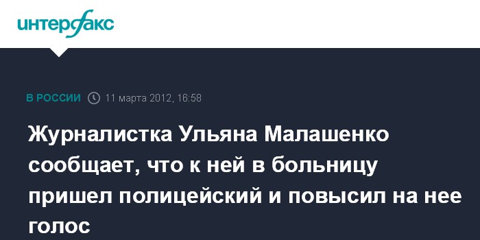 Москва. 11 марта. INTERFAX.RU - Журналистка радиостанции "Коммерсант-FM" Ульяна Малашенко, пострадавшая при разгоне полицией митинга на Лубянке 5 марта, сообщила, что к ней в больницу приходил полицейский и разговаривал с ней на повышенных тонах.