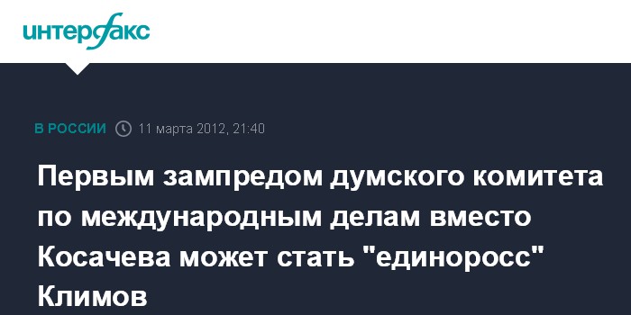 Согласно проекту постановления палаты, размещенном в ее базе данных, первым зампредом комитета по международным делам предлагается утвердить члена фракции "Единая Россия" Андрея Климова, который ранее в Госдуме занимал пост заместителя председателя этого комитета.
