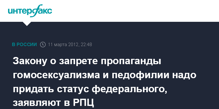 Москва. 11 марта. INTERFAX.RU - Запрет на пропаганду гомосексуализма и педофилии среди несовершеннолетних должен действовать по всей России, а не только в Петербурге, считают в Русской православной церкви.