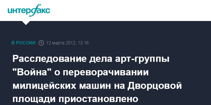 Санкт-Петербург. 12 марта. INTERFAX.RU - Следственный комитет России приостановил расследование уголовного дела об акции арт-группы "Война" "Дворцовый переворот", в ходе которой в Петербурге были опрокинуты милицейские машины.