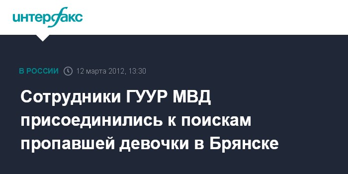 Москва/Брянск. 12 марта. INTERFAX.RU - В Брянск для розыска пропавшей 9-месячной девочки направлены опытные сыщики центрального аппарата МВД, сообщили "Интерфаксу" в пресс-центре ведомства в понедельник.