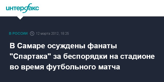 Самара. 12 марта. INTERFAX.RU - Кировский районный суд Самары приговорил к условным срокам четырех болельщиков московского футбольного клуба "Спартак", устроивших погром на местном стадионе 15 мая 2011 года во время матча с клубом "Крылья Советов". "Преступление было совершено во время футбольного матча между ФК "Крылья Советов" и ФК "Спартак" на восточной трибуне стадиона "Металлург". Злоумышленники сломали несколько пластиковых сидений на трибуне стадиона. Один из осужденных Виктор Орлов бросил сорванное сиденье в сотрудника ОМОН, причинив ему телесные повреждения", - сообщает пресс-служба СУ СКР по Самарской области в понедельник.