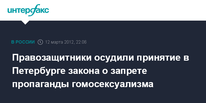 Вашингтон. 12 марта. INTERFAX.RU - Международная правозащитная организация "Хьюман райтс уотч" осудила в понедельник подписание губернатором Санкт-Петербурга Георгием Полтавченко законопроекта, устанавливающего административную ответственность за пропаганду гомосексуализма и педофилии, и призвала местную прокуратуру добиться его аннулирования.