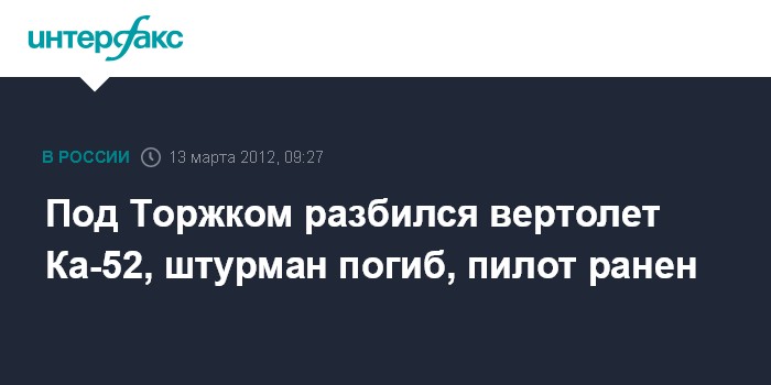 Москва. 13 марта. INTERFAX.RU - Вечером в понедельник под Торжком (Тверская область) разбился вертолет Ка-52 ВВС РФ, один пилот погиб, второй получил ранения, сообщил "Интерфаксу-АВН" во вторник официальный представитель управления пресс-службы и информации Минобороны РФ полковник Владимир Дрик.