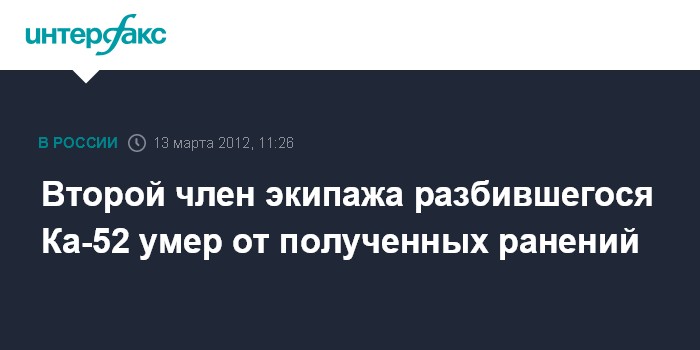 Москва. 13 марта. INTERFAX.RU - Командир экипажа вертолета Ка-52, который разбился вечером в понедельник под Торжком, скончался от полученных во время катастрофы травм, сообщил "Интерфаксу-АВН" источник, знакомый с ситуацией.