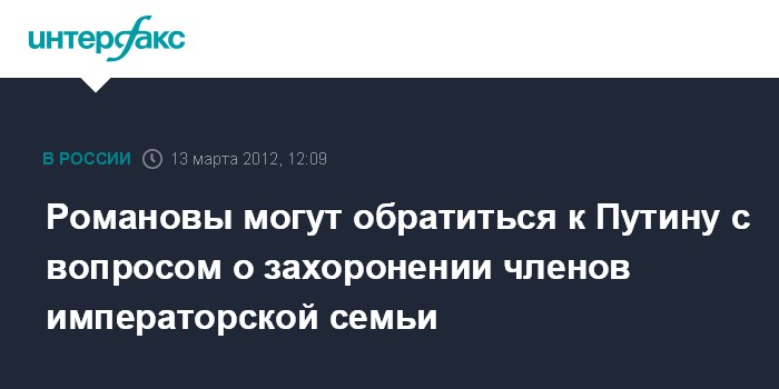 Санкт-Петербург. 13 марта. INTERFAX.RU - Представители семьи Романовых, вероятно, обратятся к Владимиру Путину после его президентской инаугурации с вопросом о захоронении останков цесаревича Алексея и великой княжны Марии, подлинность которых пока не признала Русская православная церковь.