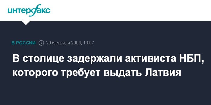 Москва. 29 февраля. INTERFAX.RU - В Москве правоохранительные органы задержали активиста запрещенной национал-большевистской партии Владимира Линдермана, известного также как Владимир Абель, экстрадиции которого добивается Латвия.