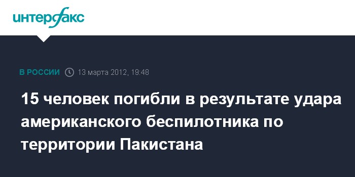 Исламабад. 13 марта. INTERFAX.RU - Не менее 15 человек погибли во вторник в результате двух ударов с американского беспилотника по южному Вазиристану - пакистанской территории, граничащей с Афганистаном.