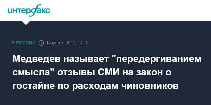 "Я посмотрел, какая этому дается интерпретация, и был удивлен. Открыл сегодня газету, и там написано, что вся информация на тему расходов государственных служащих, приобретения ими соответствующих видов имущества будет идти под грифом "секретно". Абсолютное передергивание смысла закона", - заявил Медведев в ходе встречи в среду в Сколково с представителями "Открытого правительства".