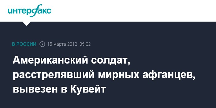 Кабул. 15 марта. ИНТЕРФАКС - Американский солдат, расстрелявший в минувшее воскресенье 16 мирных афганских граждан, вывезен из Афганистана и доставлен на военную базу США в Кувейте, сообщили американские СМИ со ссылками на военные источники.