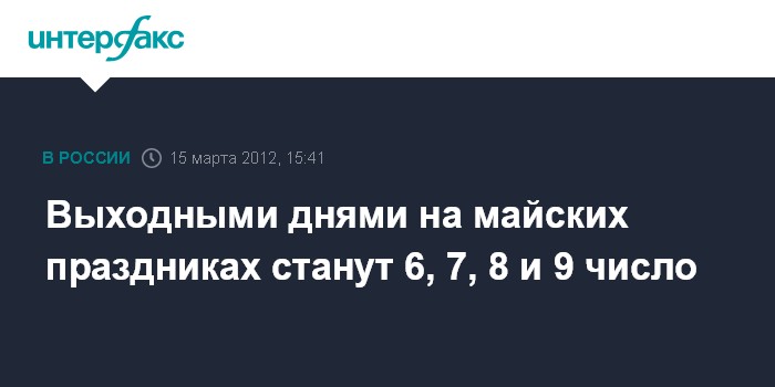 Москва. 15 марта. INTERFAX.RU - Премьер-министр РФ Владимир Путин подписал постановление, согласно которому выходными днями в мае будут считаться числа с 6-го по 9-е. "Имея в виду, что люди высказывают заинтересованность в том, чтобы в это время было больше выходных дней с тем, чтобы можно было на участки поехать, на огороды, предлагается перенести выходной день с субботы 5 мая на понедельник - 7 мая и с субботы 12 мая на вторник - 8 мая", - сказал Путин, открывая заседание президиума правительства РФ.
