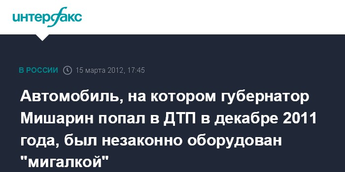 Москва. 15 марта. INTERFAX.RU - "Мигалка" на автомобиле попавшего в ДТП 1 декабря 2011 года губернатора Свердловской области Александра Мишарина была установлена незаконно, сообщило Главное управление по обеспечению безопасности дорожного движения МВД России в ответе за запрос депутата Госдумы Ярослава Нилова (фракция ЛДПР).