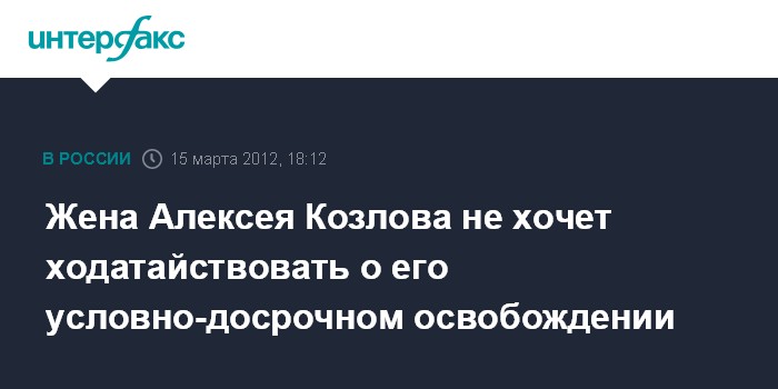 Москва. 15 марта. INTERFAX.RU - Жена бизнесмена Алексея Козлова, приговоренного к пяти годам колонии за мошенничество, не намерена просить об условно-досрочном освобождении мужа.