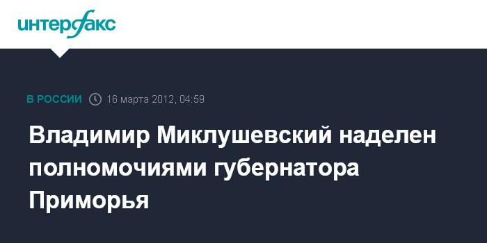 Владивосток. 16 марта. ИНТЕРФАКС-ДАЛЬНИЙ ВОСТОК – Законодательное собрание Приморья в пятницу на внеочередном заседании утвердило кандидатуру Владимира Миклушевского на пост губернатора края, сообщает корреспондент агентства "Интерфакс - Дальний Восток" с места события.